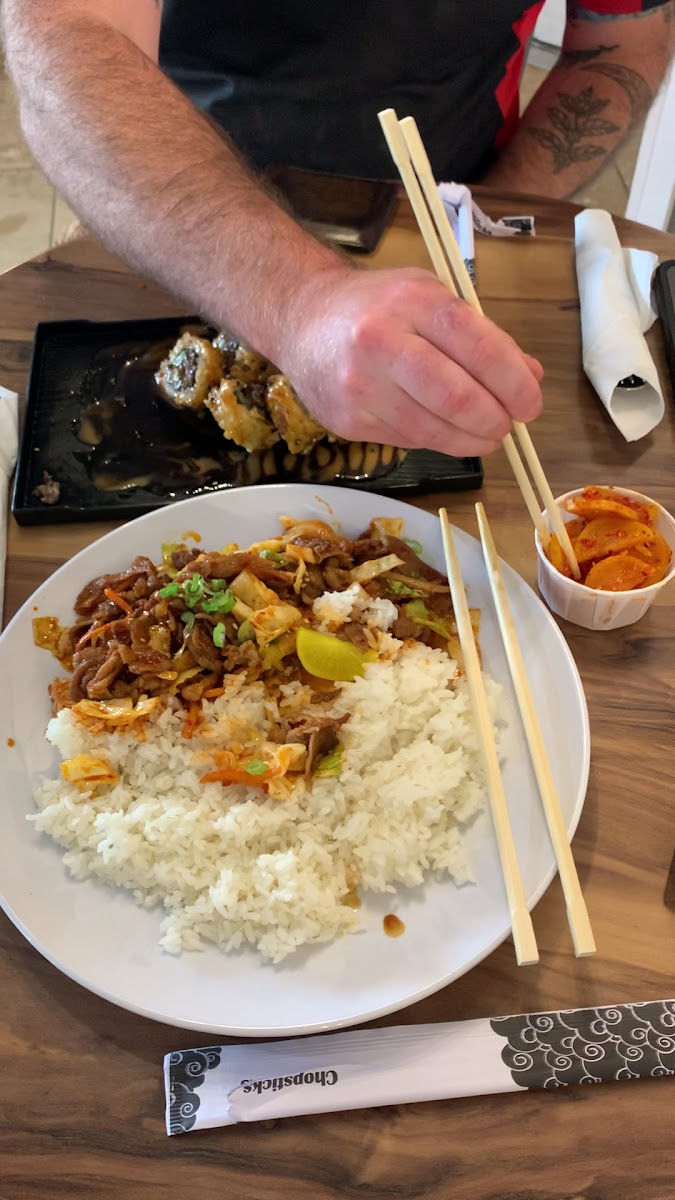 You know its a good sign when you pull up right at opening time and several people are waiting in their cars. 15 minutes after opening all seats were taken, line at the register and to-go orders piling up. Definitely a gem. Neat place, great service and a menu where I wanted to try more that I could eat in a singular visit. I didn't want to hold up things so ordered the two special Roll lunch special with side of kimchi. Kimchi most definitely made in house and was tasty, could honestly be more spicy. Beef Bulgolgi Roll was delicious , great batter and overall cohesion with cream cheese and jalapeño which I normally don't care for in sushi. Popcorn shrimp Roll was solid, shrimp were ok but the California Roll underneath was one of the better I have had. Portion sizes were a high note here with rolls befitting of special Roll size and watching other plates hit tabp tables I can see why the $10.99 lunch special is popular. For a fusion place, its done right. I can't speak based on the fresh fish etc varieties of sushi but I also didnt come for that. Look forward to trying their other offerings when in town in the future.