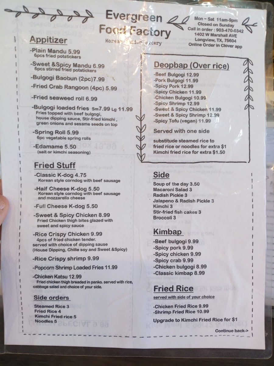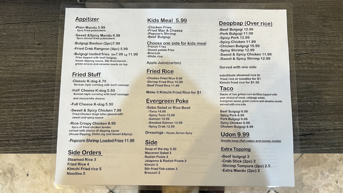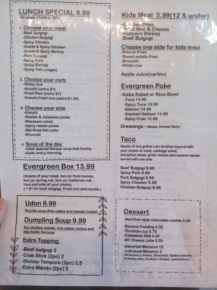 The menu at Evergreen Food Factory offers a comforting blend of casual Korean flavors, perfect for both a relaxed lunch or a satisfying dinner. The selection focuses on approachable meals and bites that pair well with the restaurant’s inviting, clean atmosphere, making it easy to enjoy time with friends or a solo meal.