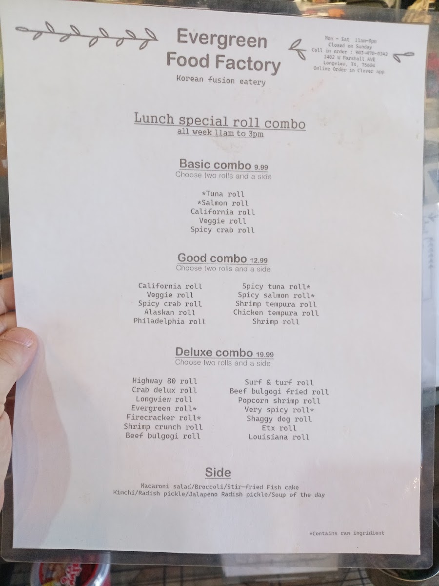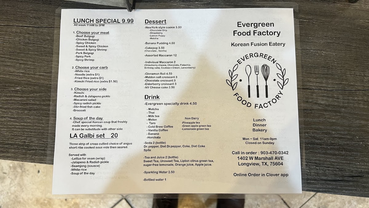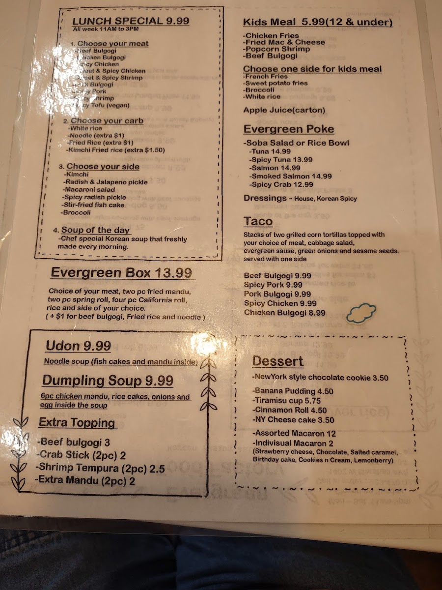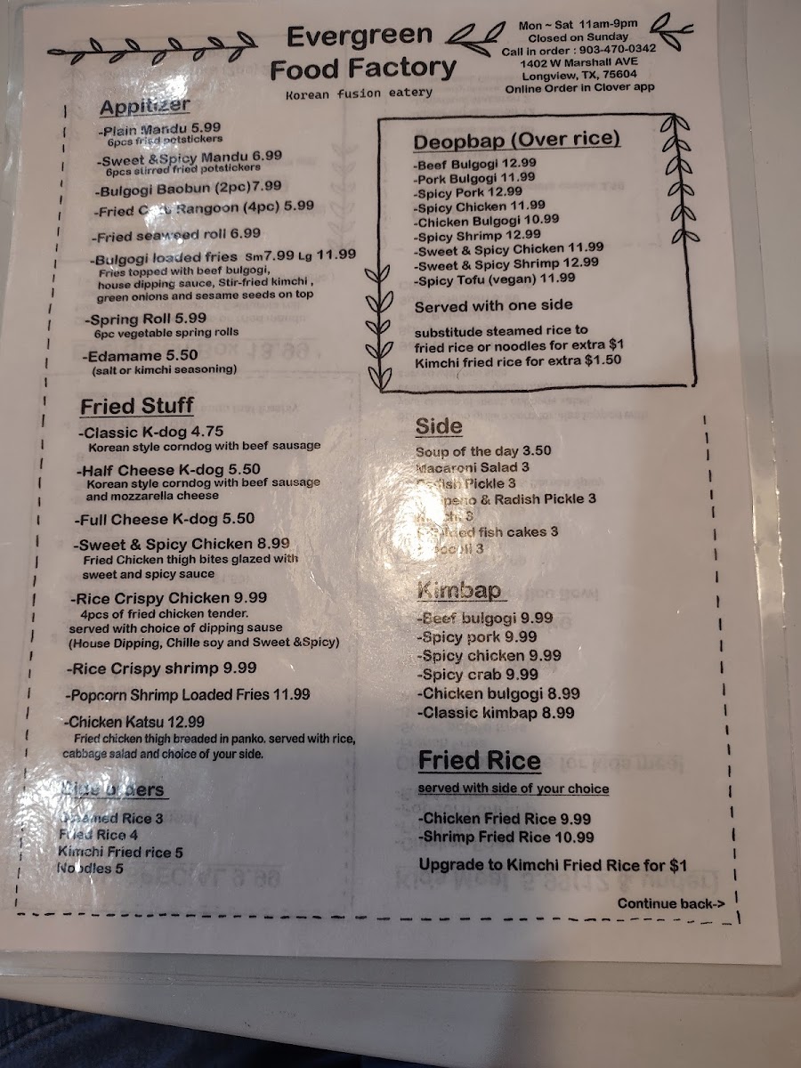 The menu at Evergreen Food Factory offers a comforting blend of casual Korean flavors, perfect for both a relaxed lunch or a satisfying dinner. The selection focuses on approachable meals and bites that pair well with the restaurant’s inviting, clean atmosphere, making it easy to enjoy time with friends or a solo meal.